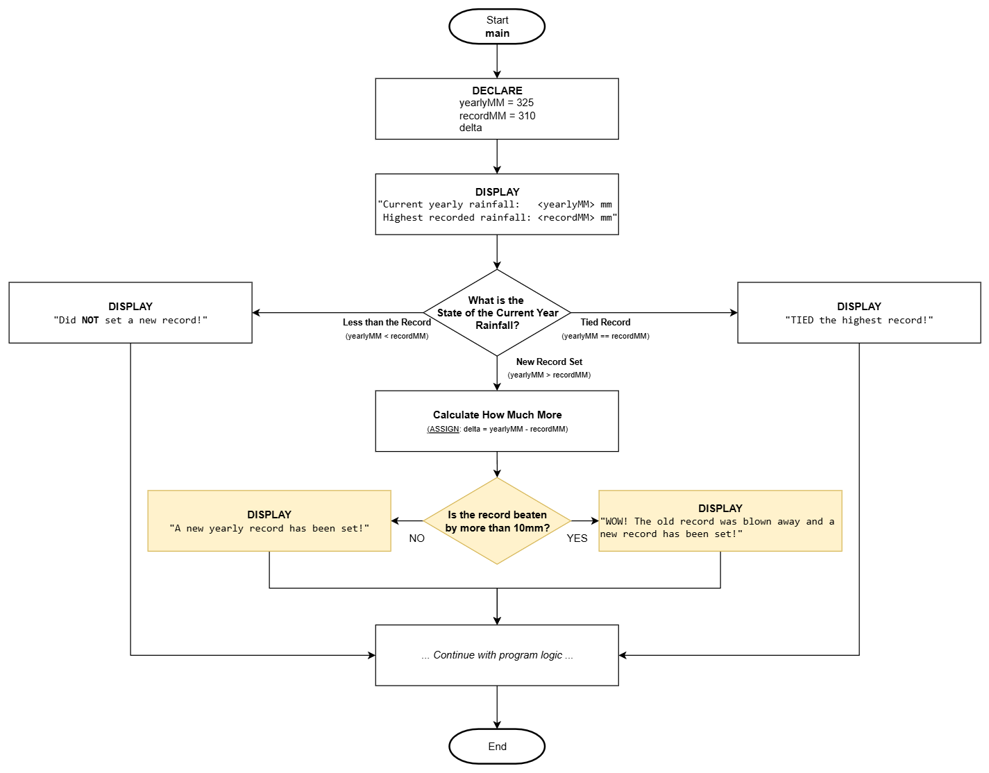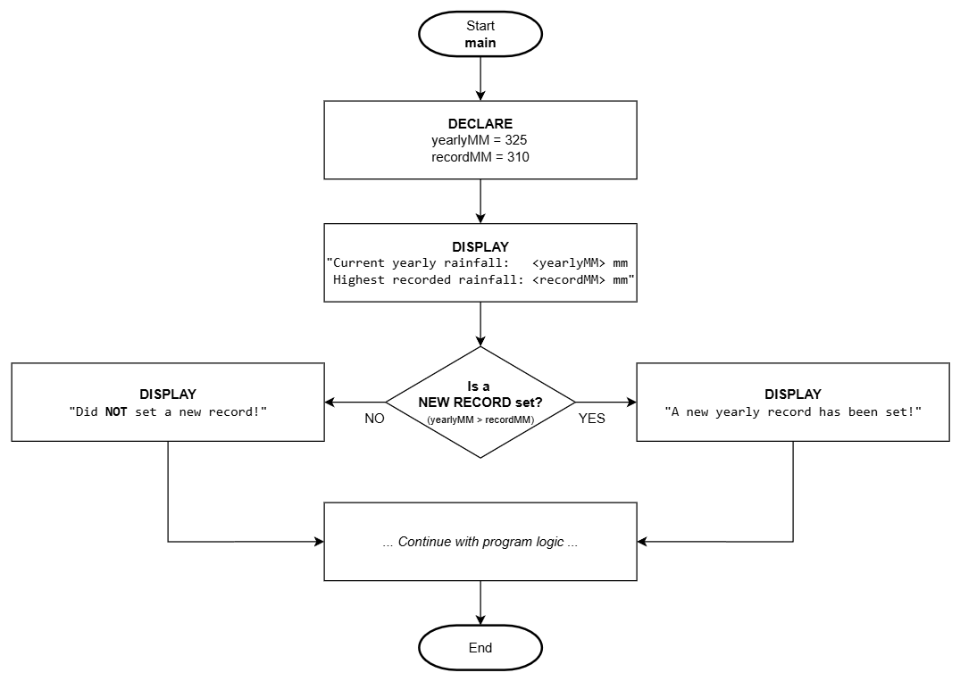 Let's review part of a program where the total yearly rainfall is being evaluated to see if it has set a new record. The program should update the highest record only when the yearly rainfall amount is determined to be more than the last known record. The logic to update the record should only occur if the yearly rainfall has been determined to be greater than the last known record. If the yearly rainfall is 325 mm and the last known record is 310 mm, we should expect the logic to update the record to the new value, otherwise, do nothing (continue with the normal program logic).